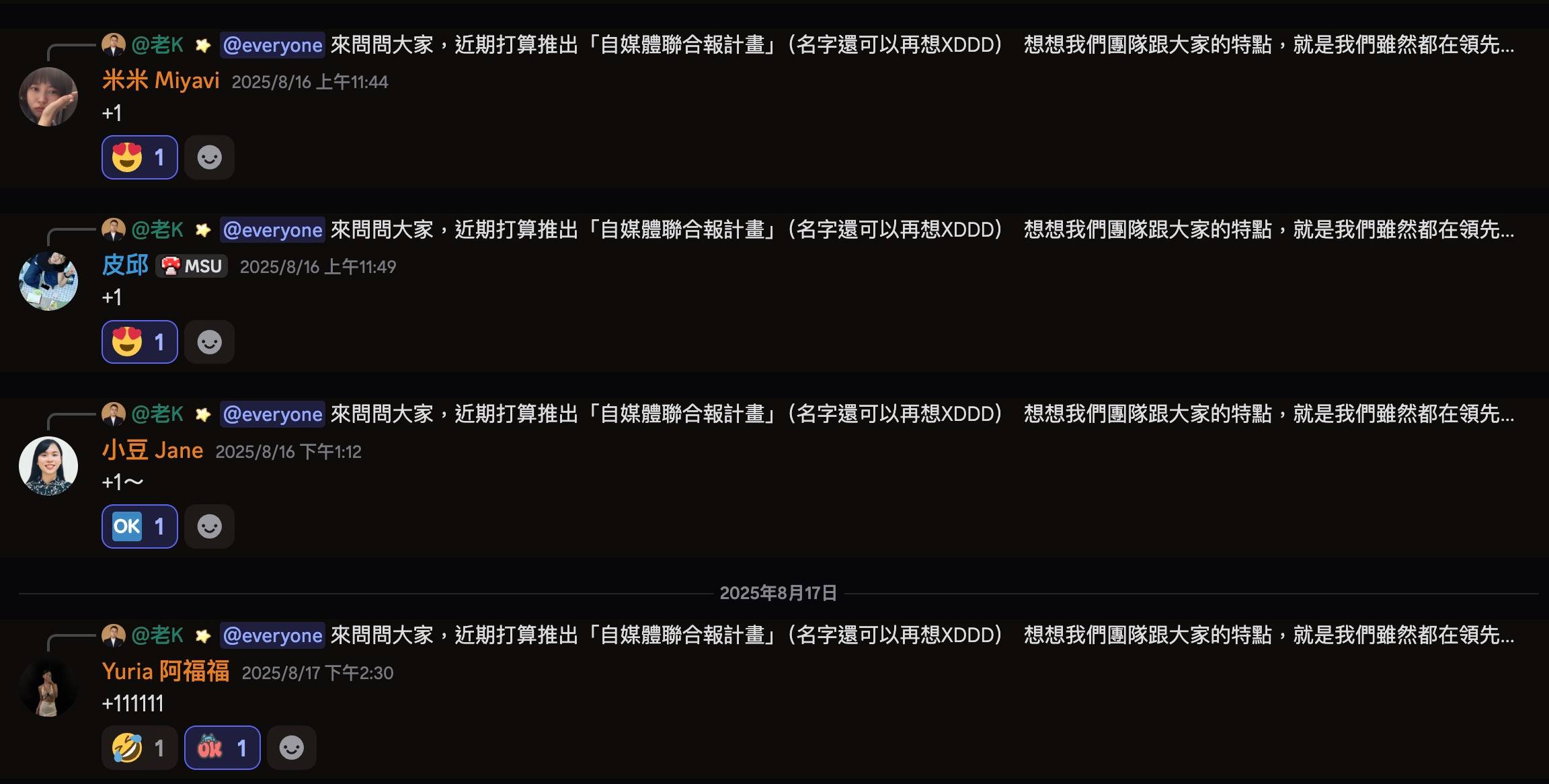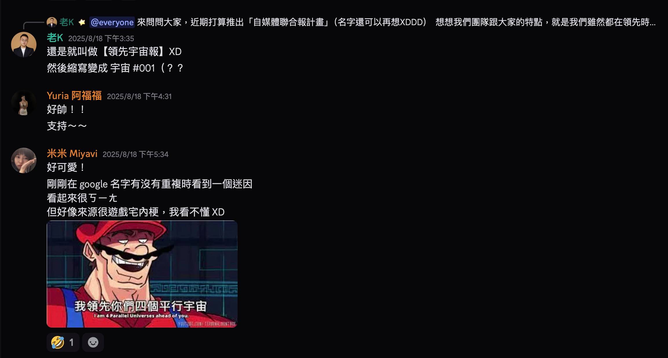 【自由宇宙 #000】開篇詞:我們要創造一份特別的電子報!嗨~我是老K👨🏻💻 這是一份新週報計畫的開篇詞,這個計畫叫做《自由宇宙報》。 我們會每週固定週四,發給你一篇關於「自由工作」、「自媒體」、「數位遊牧」的週報。 👾 這份週報有什麼特別之處呢?這份週報最大的特點,在於撰寫人「不會只有我一個」,而是所有「領先時代團隊」的夥伴們。 領先時代團隊是我從 2019 創立至今的公司、品牌,有一個很大的特點: 裡面的每一位夥伴都是自由工作者,甚至幾乎都有自己的自媒體、個人品牌,而且領先時代團隊也支持大家做各自的品牌、甚至追求大家彼此之間的合作共贏。 2025 年下半年,我一直想做點不一樣的創作嘗試,不想要走千篇一律的創作風格與取向。 想來想去,就想到了: 「既然我們團隊每個人都是品牌經營者、自由工作者,不如就把大家集合起來、一起寫一份電子報分享我們在自由工作、品牌經營、自媒體方面的經驗跟故事,讓大家一起參與到我們的自由生活!」 然後,我就跑去問了我的團隊夥伴們: 當然,領先夥伴們都是一群愛搞新花樣的自由人,得到的答覆當然是一整排的 +111111 在領先團隊未來的參與夥伴們,大家各自平常都有以下的專業技能: