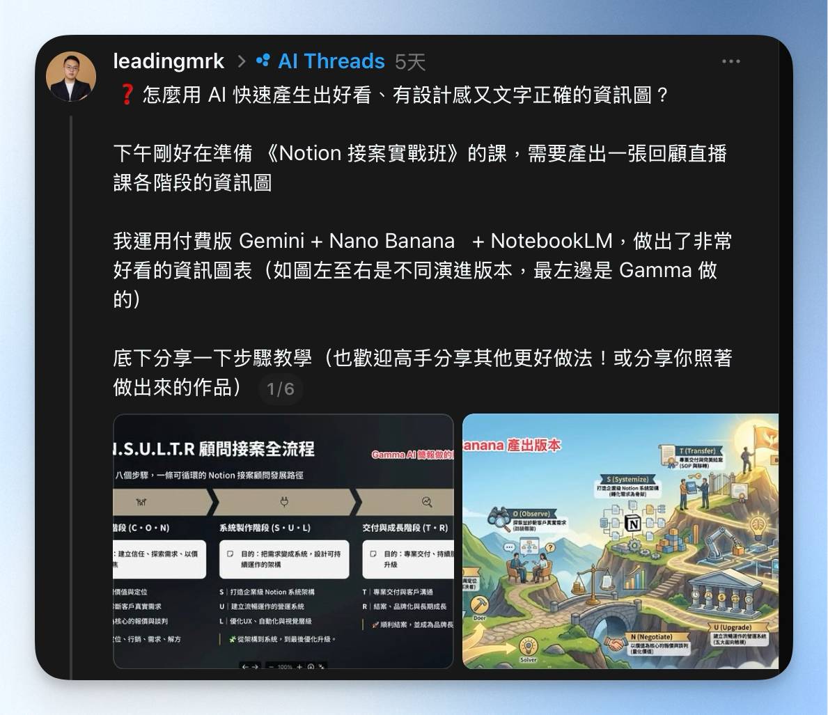嗨~我是米米 Miyavi 🌝 在你們收到這封信的時候,已經是 2025 的倒數第二天了!(好快啊) 最近我跟老K的《Notion 接案實戰班》直播課剛結束,我已經在摩拳擦掌,準備我明年的新計劃了 💪 內心充滿了期待(跟害怕 XD?),希望可以盡快跟大家分享好消息~~ 你們也做好 2026 的規劃了嗎? 剛做完 2025 回顧,我也有好多心得,其中一項就是:發展多技能 v.s. 明年的我想要開始收束幾條主線,集中火力發展。 如果你對於「多技能斜槓+2026 目標定位」有興趣,別錯過我在電子報最後分享的小故事哦! 📌 本週領先團隊創作精選 怎麼用 AI 快速產出好看、有設計感又文字正確的資訊圖? 💭 老K在這篇 Threads 分享了: 他使用哪些 AI 工具產製資訊圖 怎麼產出美觀、文字正確的圖(畢竟有用過 AI 產圖的你應該也知道,總會產出文字怪怪的圖對吧 😭) 🌝 米米點評:這次老K在 Notion 接案實戰班用的圖真的有夠精緻(驚嘆!)AI 雖然方便,但要精準產出,還是要看工具組合+下指令的技巧。有相同需求的人,別錯過這篇啦! 查看全文...