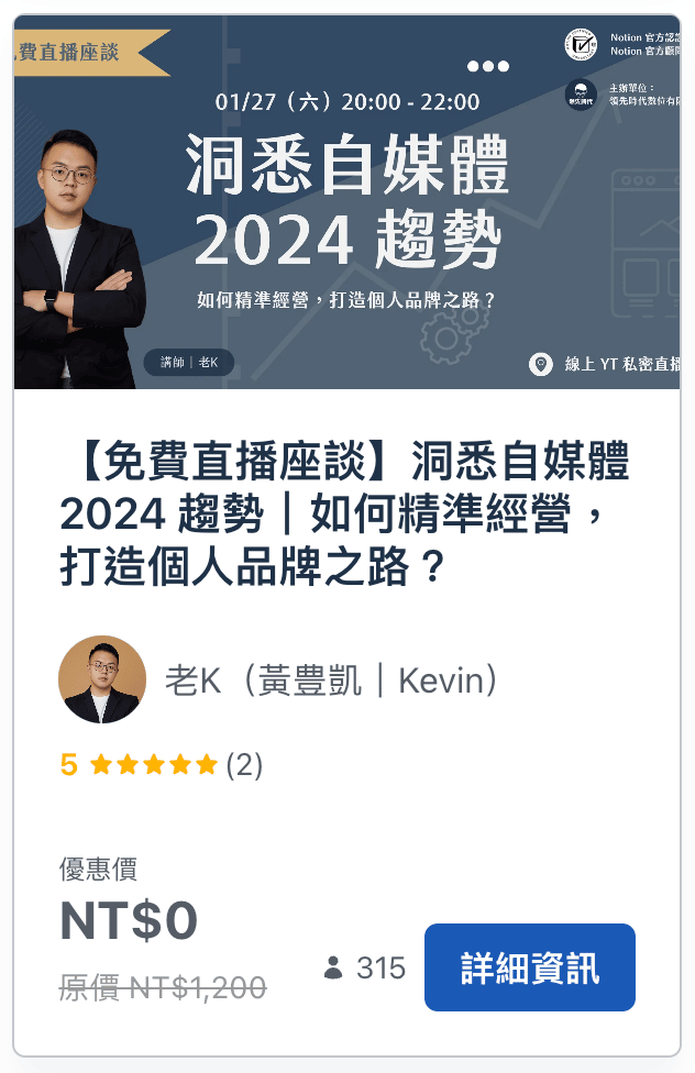 歡迎參考老K&Yuria 一起主講的《數位人生管理攻略》 課程。