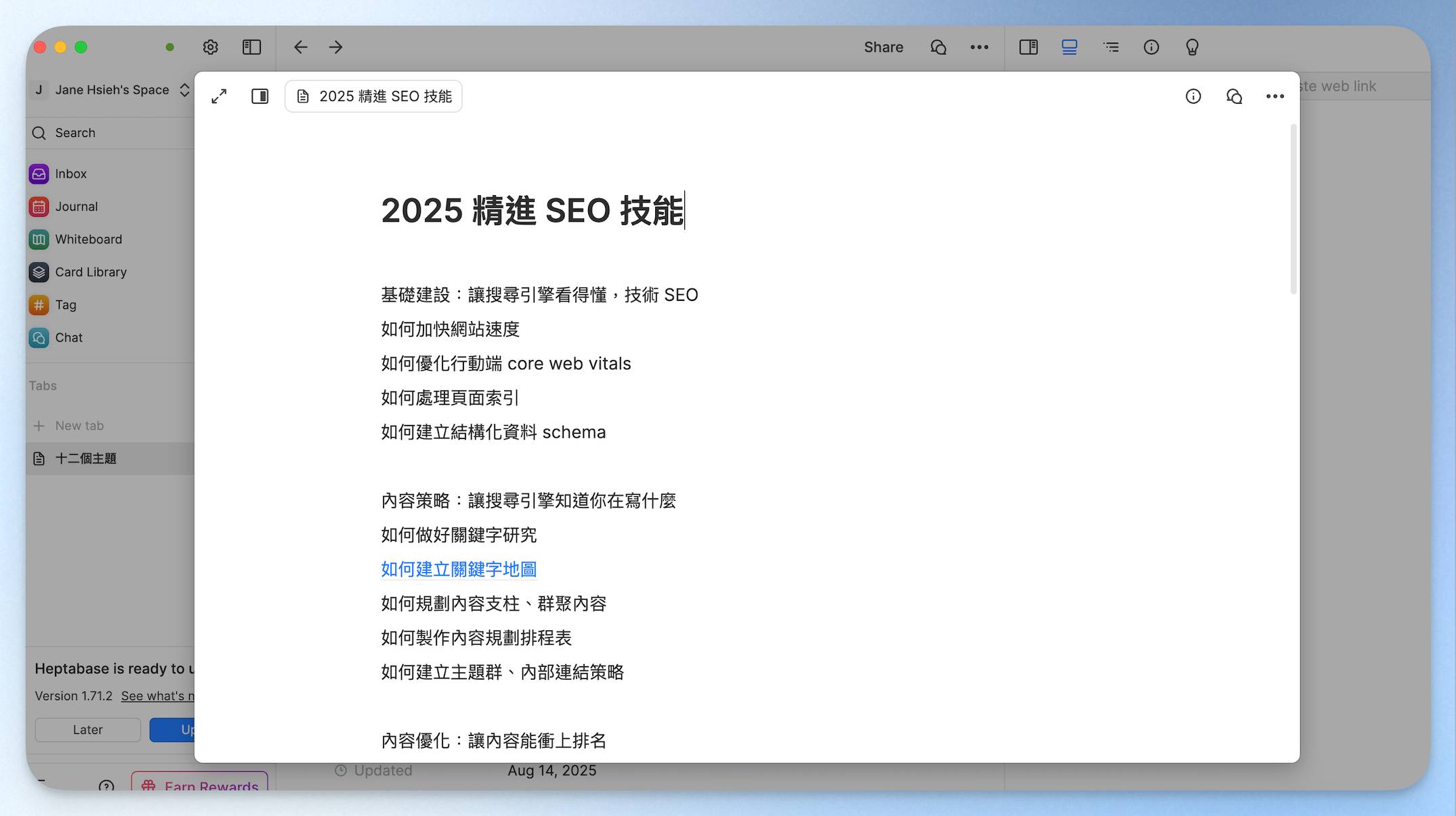 💭 本週小故事:重新找回寫筆記的初衷之前好像有跟大家分享過,我以前是 Evernote 的死忠用戶 當年真的超愛它的簡單、好上手,但自從改版後變得不太順手,就轉移陣地到 Notion 了 Notion 真的超強大,功能完整、畫面也乾淨漂亮,我一開始花了不少時間打造自己的工作與生活系統,用起來也算還不錯 但慢慢地,我開始發現一件事… 當自己狀態不太好、身體不舒服的時候,反而更難打開 Notion 比如經常會用手機快速紀錄想法,雖然我有建立一個「資訊收集箱」來捕捉靈感,但總覺得最後有種越來越亂的感覺 最後就會開始煩惱到底要放在哪個資料庫、要不要加 icon、要不要設提醒… 然後就默默放棄紀錄了(可能是完美主義又犯了吧不!🫠 這時我又想起以前用 Evernote 的時光 當時有靈感就開一個新筆記,不用想太多結構,之後再用 Tag 串連,並把相關內容整理回同一篇索引筆記中,變成一個完整的專業目錄 如果有類似的知識點,可以利用「搜尋」找到相同主題的筆記,將內容統整到同一個筆記中,變成長青筆記(Evergreen Note)⭐ 這樣記錄對我而言真的很快速簡單,最重要的是很有效! 所以,最近我開始想重新研究 Heptabase 了~ 它不只是支援 Tag 管理,也能透過卡片筆記法把經驗拆解成知識點,更符合我現在這種「零碎時間、直覺捕捉、重視反思整合」的使用需求 根據過往的習慣,我這次還是參考了電腦玩物站長 Esor 的標籤架構,像是: