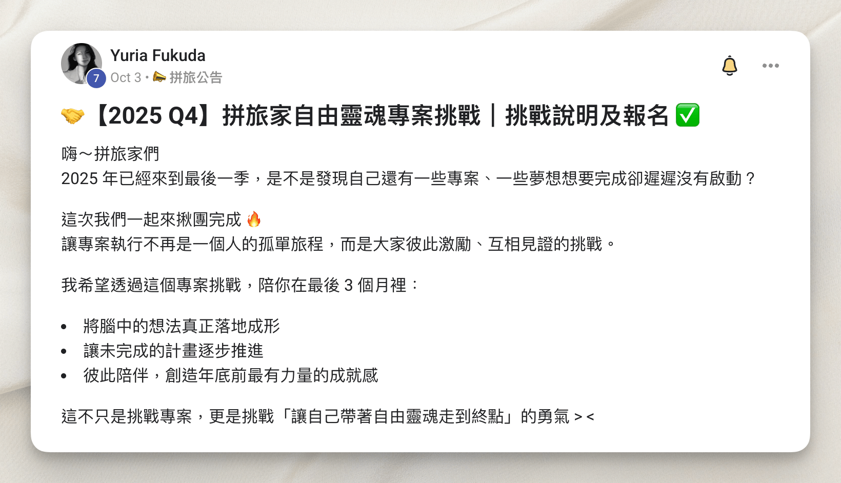 它們讓我知道了我的人生意義、讓我知道了我的外在跟內在動機 也因此我有更多的動力去完成 🔥 因為我做這些只會造就更好的我,同時也可以幫助到他人~ 關鍵四:拼旅發起的專案挑戰!最後一個就是「一群人走更快」的實例了! 因為我自己 2025 Q4 有想要執行的專案,所以我直接揪團拼旅的會員一起在 Q4 各自完成專案,但我們過程中會互相監督、互相加油鼓勵,並且定期去做覆盤 這種「我不是一個人在奮鬥」的力量真的超大 ❤️ 以上是我回顧後,我認為可以上我成為女超人的關鍵!分享給你~ 今天領先數位週報分享的內容,就到這邊。 如果有什麼想法想分享,歡迎你隨時回信跟我們聊聊 我們下週見! Best, Yuria |