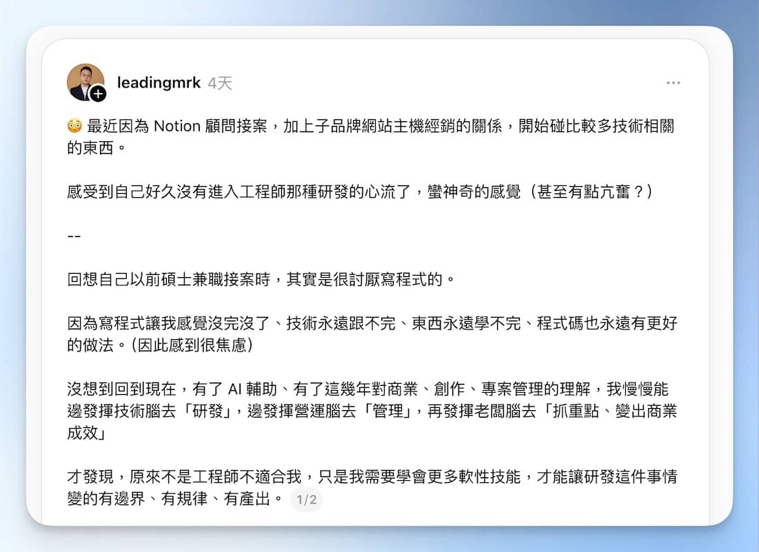 嗨~我是老K👨🏻💻。 目前人在杭州,不過四天後就要回臺灣了,這次也出國了快兩個月,有點想念在台灣的感覺了。 寫這封信時剛好是 12/1 ,也想藉由這封信,來盤點一下今年做了哪些事、有哪些感觸。 就在底下小故事的段落跟你們分享吧! 📌 本週領先團隊創作精選 ❓如果這行真的那麼賺,他幹嘛出來開課教人? 👨🏻💻 老K點評:常常看到網友們對這個議題的意見很兩極、會在公開平台上正反論戰。 為什麼高手們願意出來開課?為什麼市場上的課程會這麼多,不管什麼行業的人都想出來做知識產品? 或許這篇 Thread 文中提到的幾種視角,能讓你更清楚這些「知識產出者」都在想些什麼。 也歡迎在這篇文底下討論唷~ 查看全文 🤖 NotebookLM + Canva 做簡報 vs. Gamma AI + ChatGPT 做簡報 👨🏻💻 老K點評:上週剛好看到有網友在 Facebook 上,分享了用 NotebookLM + Canva 做簡報的方法。 自己實測過後,可以產出很精美的簡報圖示,但手動調整細節的自由度相較之下比較低。 這篇 Threads 文有錄影分享我平時備課、講課前準備的方法是「Gamma AI...