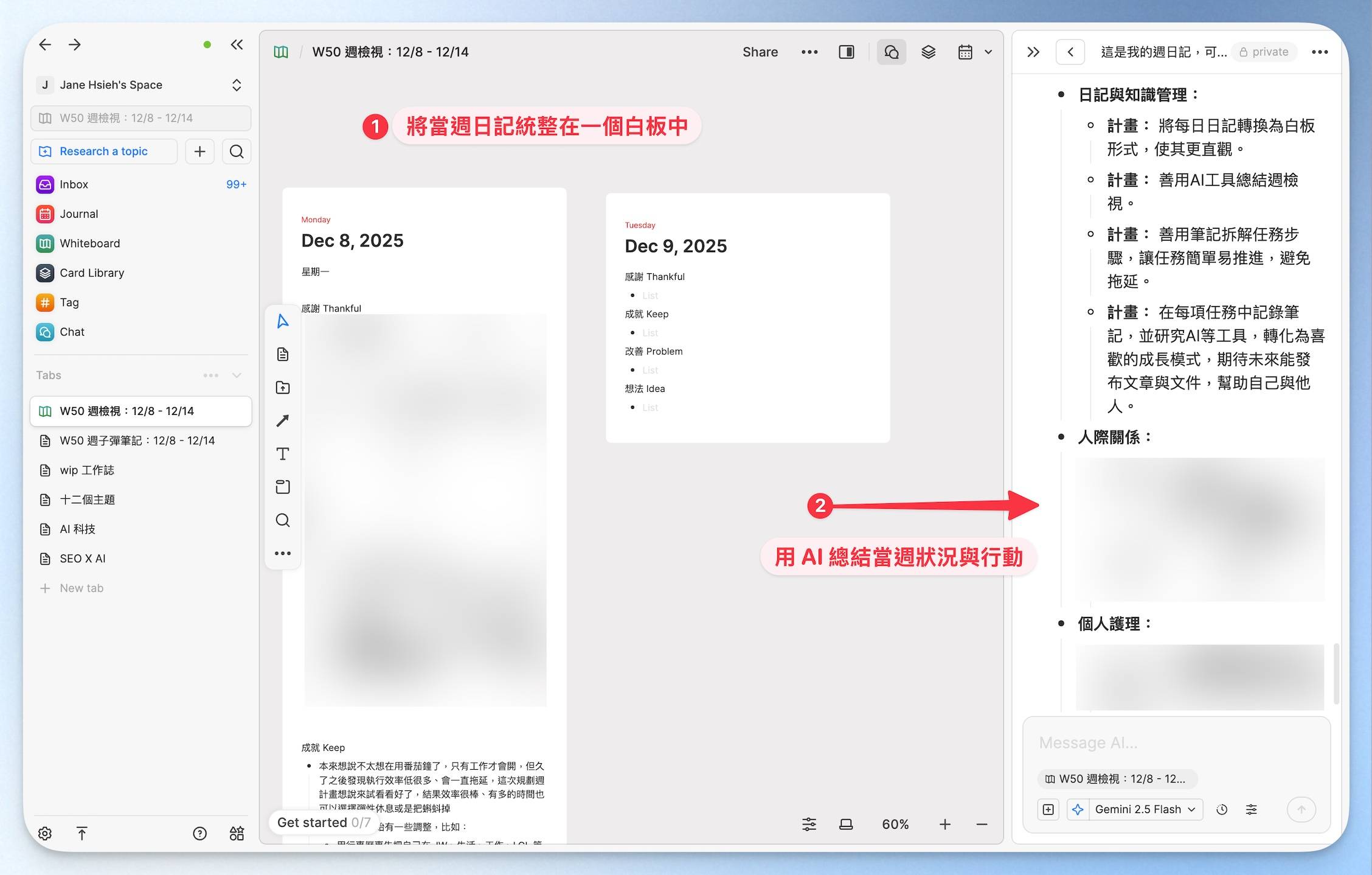 特別是感謝與成就,哪怕只是超普通的小事,我都會寫下來。 不是因為它多偉大,而是因為生活本來就由這些小確幸堆起來的。 以前的我很容易放大自己的缺點、檢視不足,但現在練習把焦點放回「那些其實很棒的小進步」。 像我停掉日記一段時間,本來會責怪自己,但現在會換個角度看:欸我今天重新開始了耶,這就是小成就啊! 不用完美,能開始就是一件值得被鼓掌的事。 而每週、每月檢視也是我很喜歡的習慣,只是以前都要一個個對照,真的很花時間。 但現在有了 AI,效率完全不同等級:它能把我一週的日記整理成: