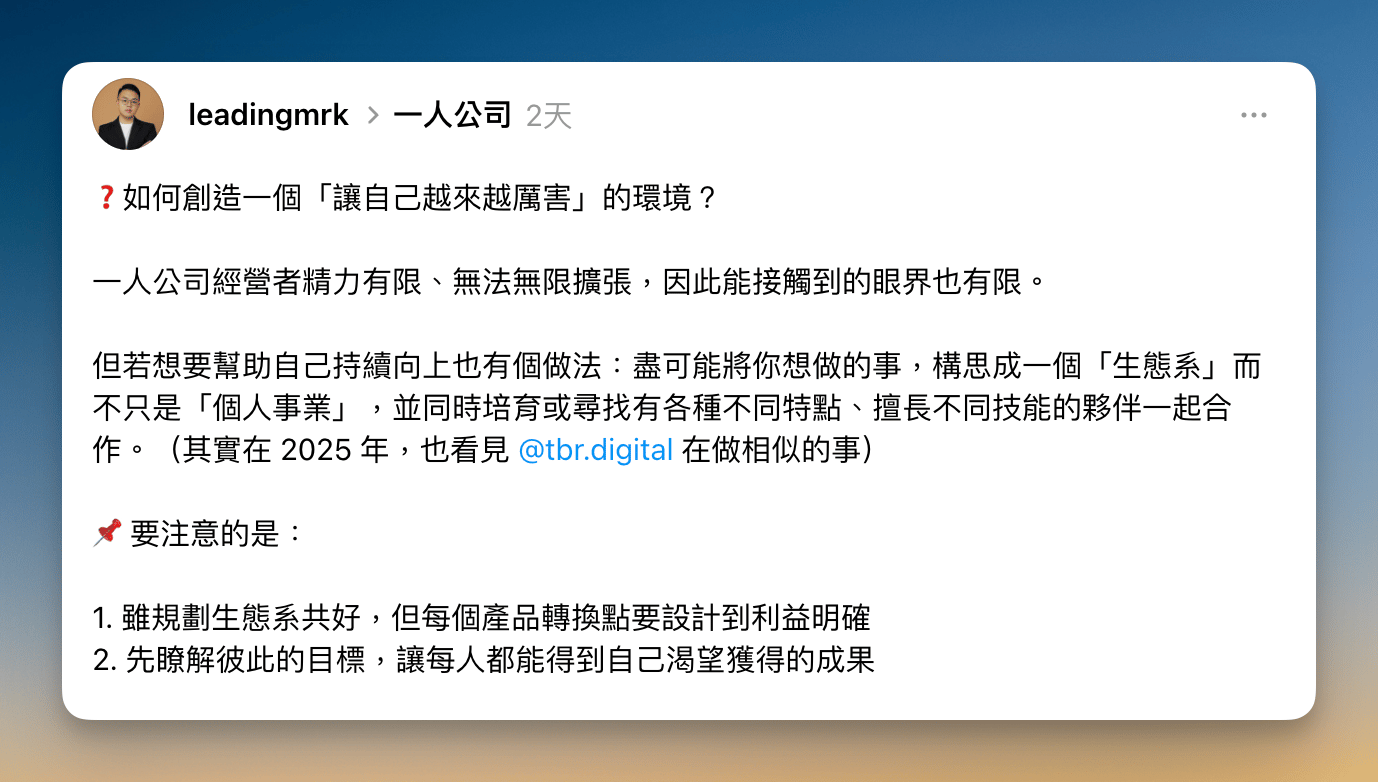 嗨~我是米米 Miyavi 🌝 在你們收到這封信的時候,已經是 2025 的倒數第二天了!(好快啊) 最近我跟老K的《Notion 接案實戰班》直播課剛結束,我已經在摩拳擦掌,準備我明年的新計劃了 💪 內心充滿了期待(跟害怕 XD?),希望可以盡快跟大家分享好消息~~ 你們也做好 2026 的規劃了嗎? 剛做完 2025 回顧,我也有好多心得,其中一項就是:發展多技能 v.s. 明年的我想要開始收束幾條主線,集中火力發展。 如果你對於「多技能斜槓+2026 目標定位」有興趣,別錯過我在電子報最後分享的小故事哦! 📌 本週領先團隊創作精選 怎麼用 AI 快速產出好看、有設計感又文字正確的資訊圖? 💭 老K在這篇 Threads 分享了: 他使用哪些 AI 工具產製資訊圖 怎麼產出美觀、文字正確的圖(畢竟有用過 AI 產圖的你應該也知道,總會產出文字怪怪的圖對吧 😭) 🌝 米米點評:這次老K在 Notion 接案實戰班用的圖真的有夠精緻(驚嘆!)AI 雖然方便,但要精準產出,還是要看工具組合+下指令的技巧。有相同需求的人,別錯過這篇啦! 查看全文...