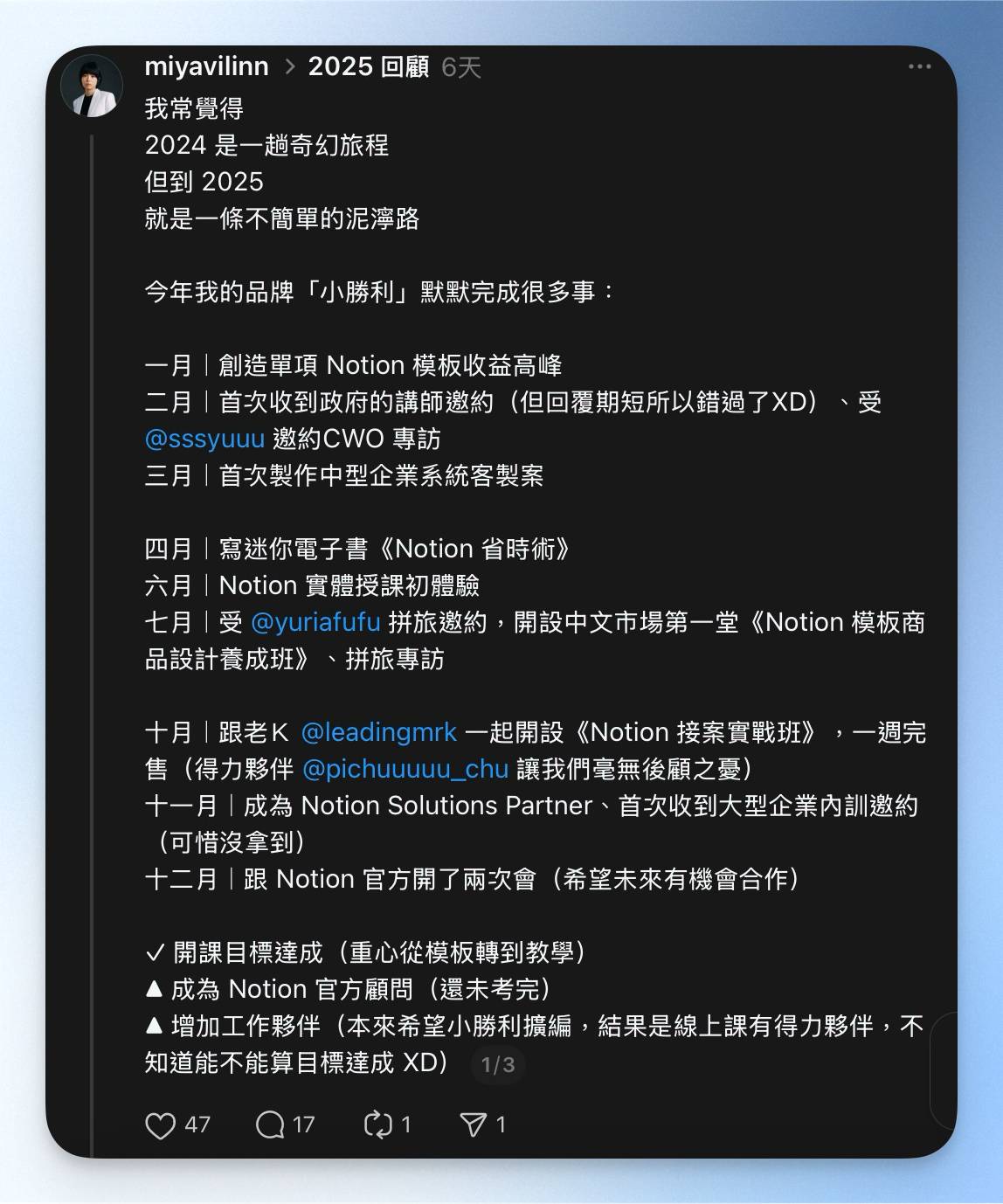 嗨~我是米米 Miyavi 🌝 在你們收到這封信的時候,已經是 2025 的倒數第二天了!(好快啊) 最近我跟老K的《Notion 接案實戰班》直播課剛結束,我已經在摩拳擦掌,準備我明年的新計劃了 💪 內心充滿了期待(跟害怕 XD?),希望可以盡快跟大家分享好消息~~ 你們也做好 2026 的規劃了嗎? 剛做完 2025 回顧,我也有好多心得,其中一項就是:發展多技能 v.s. 明年的我想要開始收束幾條主線,集中火力發展。 如果你對於「多技能斜槓+2026 目標定位」有興趣,別錯過我在電子報最後分享的小故事哦! 📌 本週領先團隊創作精選 📖 每週來點新知識!🗣 你有好資源想分享嗎?歡迎直接回信推薦給我們!