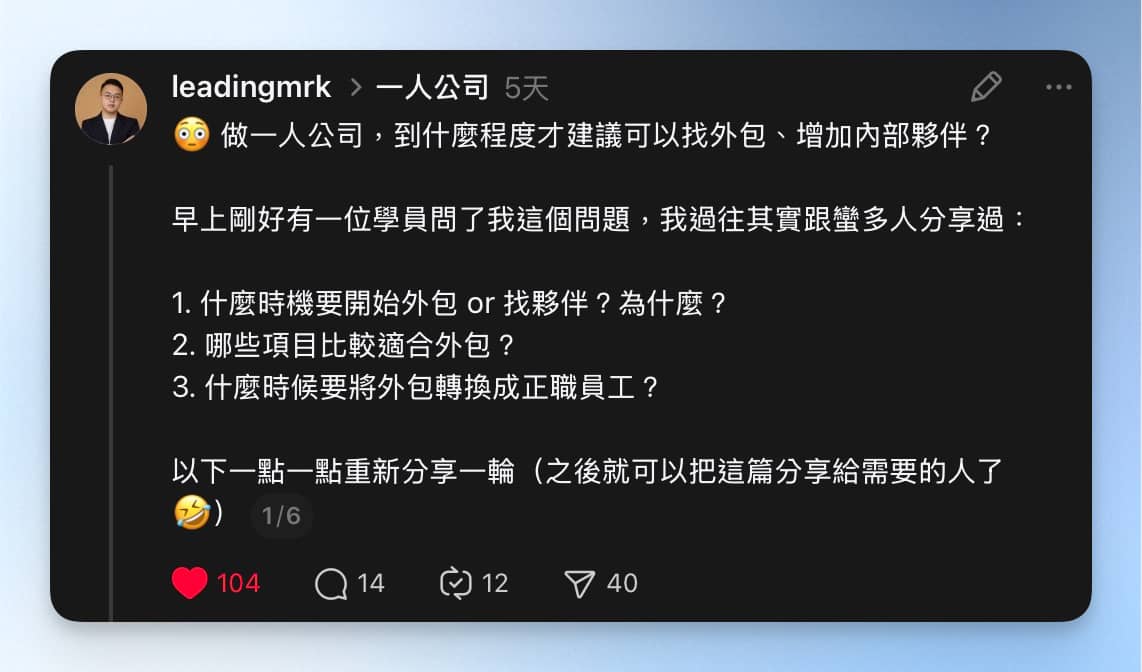 嗨~我是老K👨🏻💻。 目前人在杭州,不過四天後就要回臺灣了,這次也出國了快兩個月,有點想念在台灣的感覺了。 寫這封信時剛好是 12/1 ,也想藉由這封信,來盤點一下今年做了哪些事、有哪些感觸。 就在底下小故事的段落跟你們分享吧! 📌 本週領先團隊創作精選 ❓如果這行真的那麼賺,他幹嘛出來開課教人? 👨🏻💻 老K點評:常常看到網友們對這個議題的意見很兩極、會在公開平台上正反論戰。 為什麼高手們願意出來開課?為什麼市場上的課程會這麼多,不管什麼行業的人都想出來做知識產品? 或許這篇 Thread 文中提到的幾種視角,能讓你更清楚這些「知識產出者」都在想些什麼。 也歡迎在這篇文底下討論唷~ 查看全文 🤖 NotebookLM + Canva 做簡報 vs. Gamma AI + ChatGPT 做簡報 👨🏻💻 老K點評:上週剛好看到有網友在 Facebook 上,分享了用 NotebookLM + Canva 做簡報的方法。 自己實測過後,可以產出很精美的簡報圖示,但手動調整細節的自由度相較之下比較低。 這篇 Threads 文有錄影分享我平時備課、講課前準備的方法是「Gamma AI...