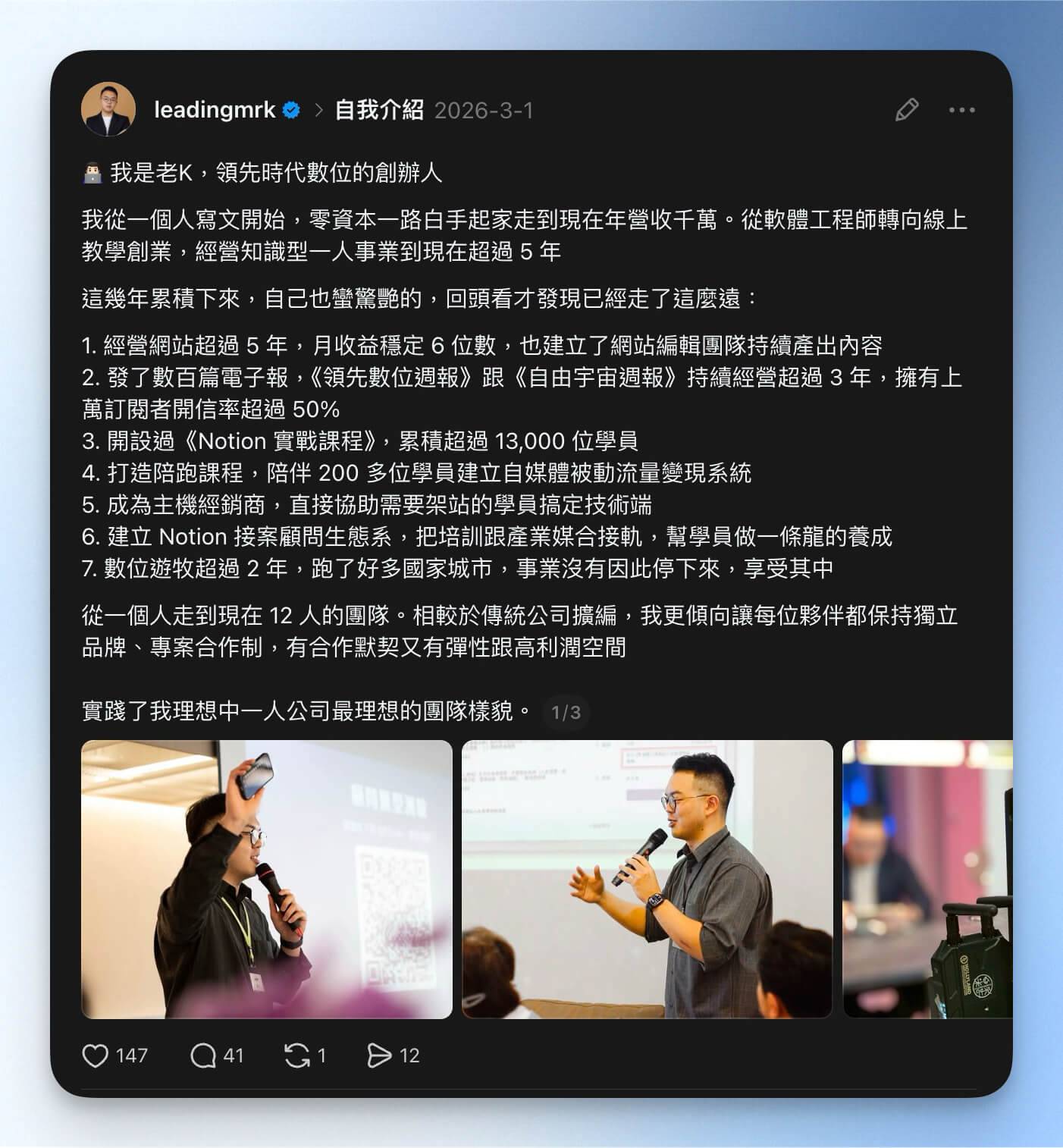 💭 本週小故事:從一個人寫文開始,到現在的領先時代最近在 Threads 上分享了一篇自我介紹,寫完之後自己也愣了一下——原來不知不覺已經走了這麼遠。今天想跟訂閱領先週報的大家好好聊聊這段路的細節。 從工程師到創業者,其實一開始只是想「試試看」 5 年多前,我還是一個軟體工程師。那時候的我其實對未來沒有太明確的想像,只是覺得:如果能靠自己的能力在網路上賺到一點收入,好像也不錯? 於是我開始寫文章、經營網站,一個人摸索 SEO、研究內容行銷。沒有團隊、沒有資金、沒有人教我怎麼做——就是一邊上班,一邊用下班時間慢慢累積。 老實說,前面那段時間真的很孤獨。你做的事情周圍的人不太理解,成果也不是馬上看得到。很多次都會懷疑自己:「這樣做到底有沒有意義?」 但我很慶幸自己沒有停下來。 後來網站慢慢有了流量,月收益慢慢突破後,讓我可以全職投入創作;接著開始寫電子報,《領先數位週報》和《自由宇宙週報》經營超過 3 年,累積了上萬訂閱者,開信率超過 50%。再後來開了《Notion 實戰課程》,累積超過 13,000 位學員 —— 這個數字到現在我自己都覺得不太真實。 每一步,都是從「不確定」中走出來的。 這幾年我做過很多嘗試:打造 BRAND 自媒體陪跑課程,陪了 200 多位學員建立自己的被動流量變現系統;為了讓學員不要卡在技術問題上,我甚至去當了主機經銷商,直接幫大家搞定架站這一段。 後來因為自己深度使用 Notion,乾脆把培訓和接案串起來,建立了一套 Notion 顧問生態系——從學習、認證到接案媒合,幫學員走完一條龍的路徑。最近又在推動「數位槓桿」這個新品牌,要跟合作顧問們一起幫更多企業導入好的數位工作流。 中間還開始了數位遊牧的生活,背著筆電跑了好多國家城市,超過 2 年。邊旅行邊工作這件事,以前覺得是別人的故事,現在回頭看,自己居然也做到了。 而讓我最有感的,是團隊這件事。 從一個人走到現在 11 人的團隊,但我們不是傳統公司那種擴編方式。每位夥伴都保持自己的獨立品牌,用專案合作制來協作——有默契、有彈性,大家一起走也更有動力。 這是我理想中「一人公司」最好的樣子: 一人事業不是「只有一個人」,而是「以一個人的人生最佳化為核心」,去構建一套可持續的系統與團隊。 回頭看這 5 年多,我覺得最關鍵的不是哪一個產品做對了、哪一堂課賣得好,而是——我願意一直走在路上,即使不確定前面有什麼。 如果你現在也正在某個「不確定」的階段,不管是剛開始探索、還是已經走了一段但有點迷茫,我想跟你說:那個不確定的感覺是正常的,重要的是你有沒有持續在走。 歡迎去看我在 Threads 上的完整分享,裡面有更多細節:老K 的創業歷程 也歡迎直接回信跟我聊聊你目前的狀況,一起聊聊交流 🙌 今天領先數位週報分享的內容,就到這邊。 如果有什麼想法想分享,歡迎你隨時回信跟我們聊聊 我們下週見! |
